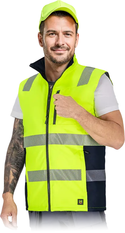 La fodera trapuntata in poliestere (50 g/m²) mantiene costante la temperatura corporea, mentre le bande riflettenti segmentate e il tessuto fluorescente garantiscono visibilità certificata secondo EN ISO 20471 Classe 1.