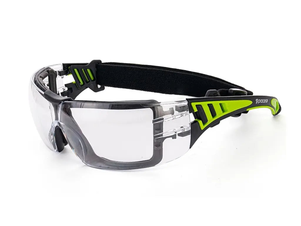 La montatura di tenuta in schiuma EVA riduce l’ingresso di polveri/spruzzi leggeri. L’elastico incluso mantiene gli occhiali in posizione durante movimenti dinamici o lavori sopra testa.